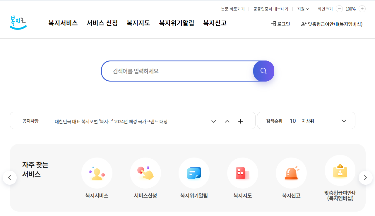 1. 복지로 홈페이지 접속후 우측 상단 로그인 버튼을 통해 로그인 한다.
