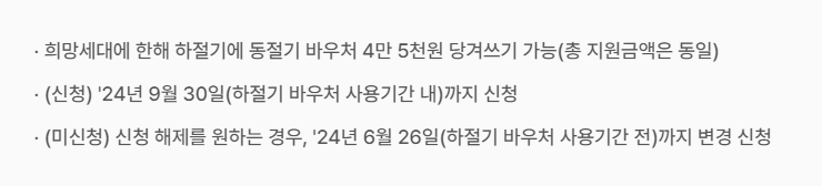 동절기 바우처 하절길 당겨쓰기 제도를 운영하고 있으며, 타동절기 에너지이용권(연탄쿠폰, 등유바우처)을 신청(예정)할 경우 하절기 당겨쓰기 신청이 불가 합니다.